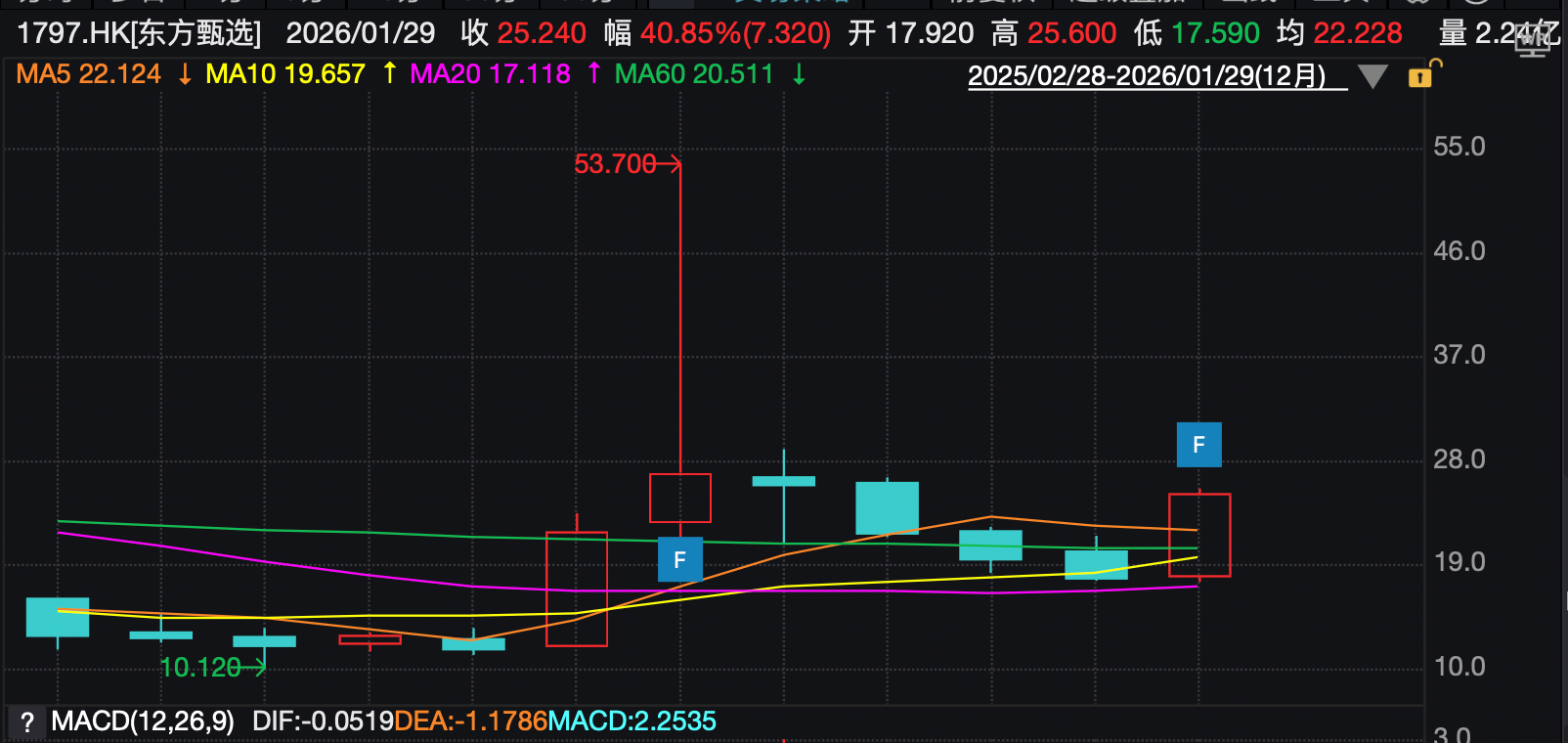 东方甄选股价近一年整体上涨但剧烈震荡。 1月29日,港股收盘,东方甄选(1797.HK)股价涨14.21%至25.24港元,总市值266亿港元。 消息面上,东方甄选2026财年中期财报显示,公司2026财年上半年营收23.116亿元,同比增长5.7%;期内溢利2.39亿元,上年同期亏损9650.3万元。 财报电话会上,东方甄选董事长俞敏洪、东方甄选执行总裁孙进、东方甄选CFO尹强回应公司目前业务情况。 去年12月,俞敏洪确认,由新东方教育科技集团副总裁孙进担任东方甄选执行总裁。此次电话会上,俞敏洪对孙进充分肯定。他称,孙进在新东方工作近二 十年,是解决问题的高手,曾带动新东方华南区整体年收入从不足10亿元增至近40亿元。选择孙进接手东方甄选,看重的是他推动业务增长的潜力,以及对 他文化与价值观的高度认同。 此番首次亮相的新任执行总裁,同样是从新东方集团内部提拔任用。在可预见的一段时间内,东方甄选身上的新东方文化烙印,仍将持续留存。 财报显示,该财季东方甄选自营产品及直播电商业务总GMV为41亿元,上年同期为48亿元。其中来自抖音的GMV占大部分,来自东方甄选APP的GMV约 18.5%。董宇辉离开后,东方甄选 ...