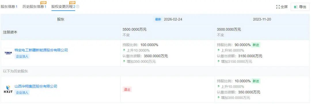 近日,华特(隰县)新能源科技有限公司(以下简称:隰县新能源)股权发生变更,山西华翔集团股份有限公司(以下简称:华翔集团)退出公司股东一 列,特变电工新疆新能源股份有限公司(以下简称:特变电工新能源)成为公司全资股东。 据天眼查信息,隰县新能源成立于2023年11月,位于山西省临汾市隰县下李乡均庄村农副产品加工园 (二号园),经营范围包含风电场相关系统研发;建筑 材料生产专用机械制造;水泥制品制造;非居住房地产租赁;机械设备租赁。 | VIP VIP 股东信息 历史股东信息 股权变更历程2 | | | 、全屏 | 미 승규 | | --- | --- | --- | --- | --- | | 股东 | 最新 2026-02-24 | 2023-11-20 | | | | 注册资本 | 3500.0000万元 | 3500.0000万元 | | | | | 不变 | 不变 | | | | 特变电工新疆新能源股份有限公司 企业法人 | 持股比例:100.0000% ↑ 上升10.0000% | 持股比例:90.0000% 新进 ·上升90.0000% 认缴出资额:3150.0000万元 | | | | ruen ...