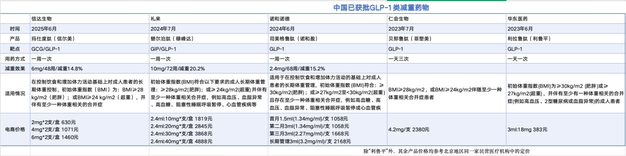 整理 | GLP1减重宝典内容团队 目前,中国已上市的减重药物共有六种:新一代药物包括司美格鲁肽、替尔泊肽和玛仕度肽;传统药物则有贝那鲁肽、利拉鲁肽和奥利 司他。 相较第一代药物,新一代GLP-1类药物(司美格鲁肽、替尔泊肽、玛仕度肽)具有更长的作用时间,减重效果更为显著。 目前全球范围内获批用于减重的GLP-1药物均为皮下注射剂型,尚无口服版本问世。司美格鲁肽的口服制剂(Rybelsus,诺和忻®)目 前仅被批准用于治疗2型糖尿病。 ▍六种减重药物 中国市场现有的六种药物在作用机制和适用人群上各有差异。新一代药物在安全性与疗效方面表现更佳,而传统药物仍在部分患者群体 中发挥重要作用。 | 药品 | 生产商 | 靶点 | 代数 | 减重机制 | 给药方式 | | --- | --- | --- | --- | --- | --- | | | 多家企业 | 特异性胃肠道 | | 通过抑制胃肠道内脂肪 酶的活性,减少肠道对脂 | | | 興利司他 | | | 1 | 肪的吸收,从而达到控制 | 随餐口服 | | | 具有生产 | 脂肪酶抑制剂 | | 体重和改善代谢异常的 | | | | | | | 目的。 | ...