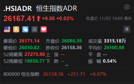 Core Points - The Hang Seng Index (HSI) closed at 26,167.41, reflecting a slight increase of 0.03% on November 3, 2023 [1] - Major blue-chip stocks showed mixed performance, with HSBC Holdings rising by 1.13% while Tencent Holdings fell by 0.21% [2]   Stock Performance Summary - Tencent Holdings: Latest price at 628.00 HKD, down by 1.00 HKD (-0.16%), ADR price at 626.678 HKD, a decrease of 1.322 HKD compared to the Hong Kong market [3] - Alibaba Group: Latest price at 163.20 HKD, down by 1.90 HKD (-1.15%), ADR price at 162.916 HKD, a decrease of 0.284 HKD compared to the Hong Kong market [3] - HSBC Holdings: Latest price at 108.30 HKD, up by 0.20 HKD (+0.19%), ADR price at 109.527 HKD, an increase of 1.227 HKD compared to the Hong Kong market [3] - AIA Group: Latest price at 79.95 HKD, up by 4.50 HKD (+5.96%), ADR price at 79.996 HKD, a slight increase of 0.046 HKD compared to the Hong Kong market [3] - BYD Company: Latest price at 99.10 HKD, down by 1.50 HKD (-1.49%), ADR price at 98.008 HKD, a decrease of 1.092 HKD compared to the Hong Kong market [3]