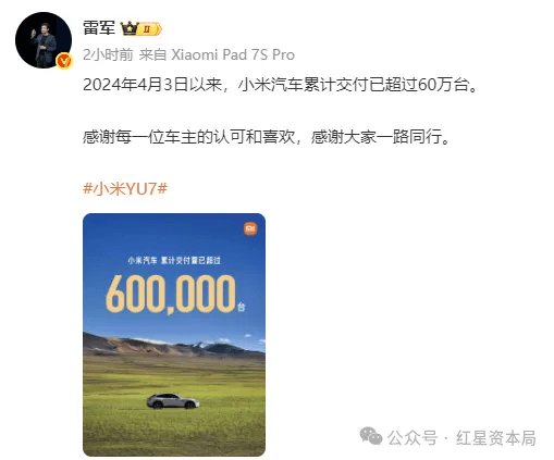 红星资本局2月13日消息,小米集团(01810.HK)董事长雷军宣布,自2024年4月3日以来,小米汽车累 计交付量已超过60万台。他同时表示,新一代小米SU7的展车已经到店。 2月12日,雷军发文称,小米YU7今年1月的销量达37869台。按照第三方平台的排行榜,小米YU7为1月 乘用车零售销量冠军。他表示:"这个排名含金量很高,不带任何定义,不论能源形式,不论价钱,不 论SUV/轿车。" 红星资本局注意到,如果以批发销量为统计口径,小米YU7排名第五。 乘联分会2月12日公布的《2026年1月份全国乘用车市场分析》显示,1月乘用车批发销量超2万辆的车型 有17个(上月27个),比亚迪宋为42227辆、吉利星愿为41676辆、博越为41296辆、特斯拉Model Y为 38916辆、小米YU7为37869辆。 1月全国乘用车市场零售154.4万辆,同比下降13.9%。其中自主品牌零售89万辆,同比下降18%;主流 合资品牌零售47万辆,同比下降4%;豪华车零售18万辆,同比下降15%。 1月新能源乘用车市场零售59.6万辆,同比下降20.0%;1月常规燃油乘用车零售94.8万辆,同比下降 10%。1月新能源 ...