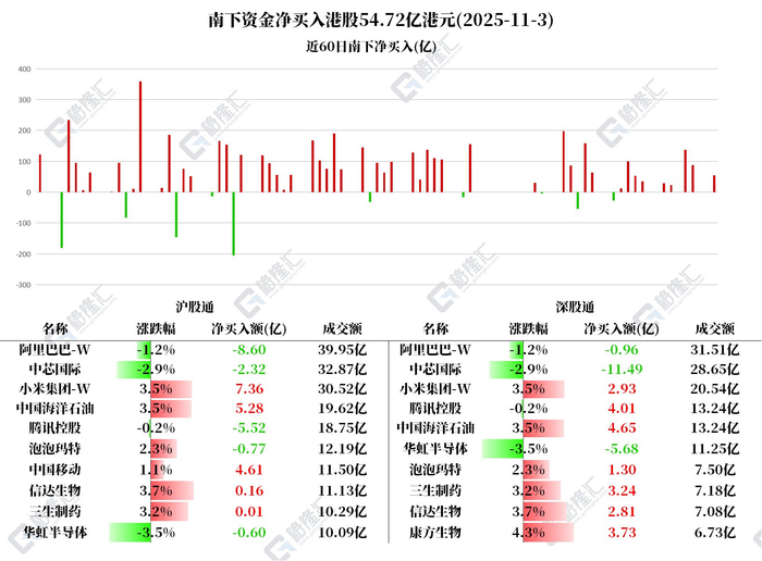 格隆汇11月3日|南下资金今日净买入港股54.72亿港元。其中: 据统计,南下资金已连续4日净买入小米,共计19.1269亿港元;连续3日净买入中海油,共计16.0304亿 港元;连续4日净卖出腾讯,共计19.9056亿港元。(格隆汇) | 小米集团-W | 3.5% | 7.36 | 30.52亿 | 小米集团-W | 3.5% | 2.93 | 20.54亿 | | --- | --- | --- | --- | --- | --- | --- | --- | | 中国海洋石油 | 3.5% | 5.28 | 19.62 Z | 腾讯控股 | -0.2% | 4.01 | 13.24亿 | | 腾讯控股 | -0.2% | -5.52 | 18.75 Z | 中国海洋石油 | 3.5% | 4.65 | 13.24亿 | | 泡泡玛特 | 2.3% | -0.77 | 12.19亿 | 作虹半导体 | -3.5% | -5.68 | 11.25亿 | | 中国移动 | 1.1% | 4.61 | 11.50亿 | 泡泡玛特 | 2.3% | 1.30 | 7.50亿 | | 信达生物 | 3.7% | 0 ...
