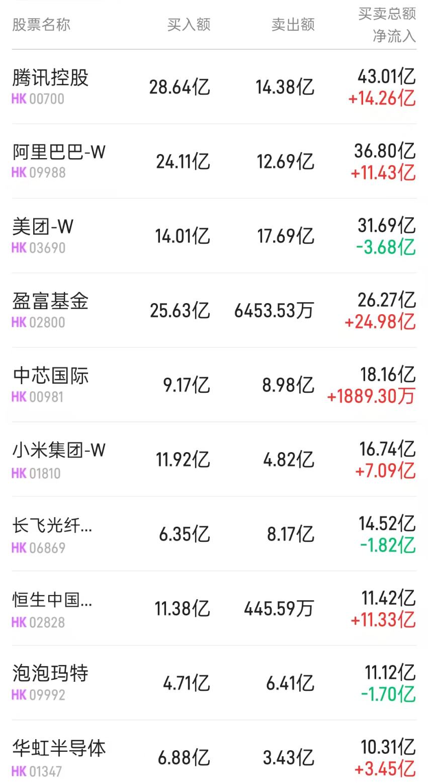 北水动向|北水成交净买入202.19亿 北水抢筹港股ETF及科技股 全天加仓盈富基金(02800)超36亿港元