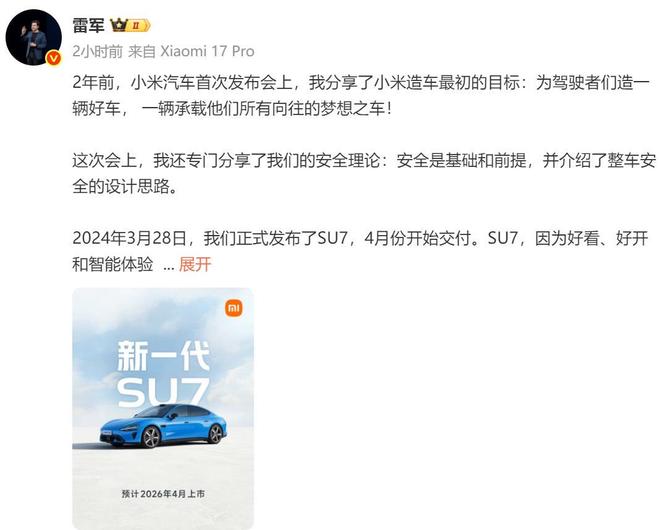 【环球网科技综合报道】1月7日消息,小米创办人,董事长兼CEO雷军在社交平台发文称,SU7 首次 改款——新一代SU7将于4月上市。 来源:环球网 据介绍,在用户反馈的推动下,小米即将推出SU7的首次改款车型——新一代SU7。新车将于2026年4 月正式上市,并于今日上午10点开启小订。 雷军透露,新一代SU7在延续"驾驶者之车"定位的基础上,进行了全方位升级:新增车身颜色、轮毂样 式与内饰方案;全系标配激光雷达,辅助驾驶系统实现满配;续航能力取得重大突破;同时搭载更先进 的智能底盘与更强大的智能座舱系统,进一步提升驾乘质感与智能化体验。(青云) 据雷军介绍,小米汽车首款车型SU7自2024年3月28日正式发布、4月启动交付以来,累计交付量已突破 36万辆,月均交付超过1.7万辆。 "为驾驶者们造一辆好车,一辆承载他们所有向往的梦想之车。" 雷军回顾了小米造车的初心,并强 调,安全始终是小米汽车设计的基础与前提,并在初代SU7中全面贯彻了整车安全理念。 ...