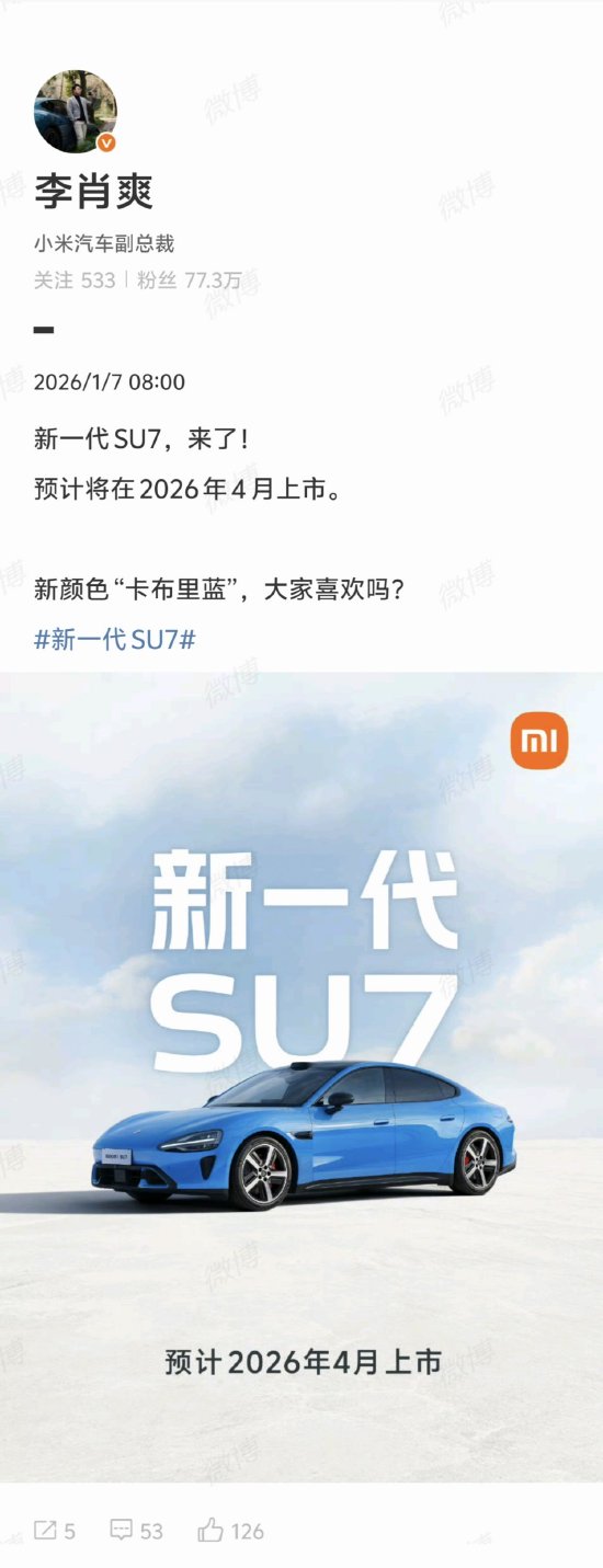 新浪科技讯 1月7日早间消息,小米汽车副总裁李肖爽今日在微博发文称,"新一代SU7,来了!预计将 在2026年4月上市。"他还晒出了新一代小米SU7的新颜色"卡布里蓝"。 责任编辑:屠欣怡 新浪科技讯 1月7日早间消息,小米汽车副总裁李肖爽今日在微博发文称,"新一代SU7,来了!预计将 在2026年4月上市。"他还晒出了新一代小米SU7的新颜色"卡布里蓝"。 责任编辑:屠欣怡 ...