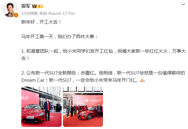 小米创办人雷军今日发文称,新年好,开工大吉!马年开工第一天,我们办了两件大事: 责任编辑:王翔 1. 和高管团队一起,给小米同学们发开工红包,祝福大家新一年红红火火,万事大吉! 2. 公布新一代SU7全新颜色:赤霞红。我相信,新一代SU7依然是一台值得期待的Dream Car!新一代 SU7,一定会给小米带来马年开门红。 小米创办人雷军今日发文称,新年好,开工大吉!马年开工第一天,我们办了两件大事: 1. 和高管团队一起,给小米同学们发开工红包,祝福大家新一年红红火火,万事大吉! 责任编辑:王翔 2. 公布新一代SU7全新颜色:赤霞红。我相信,新一代SU7依然是一台值得期待的Dream Car!新一代 SU7,一定会给小米带来马年开门红。 ...