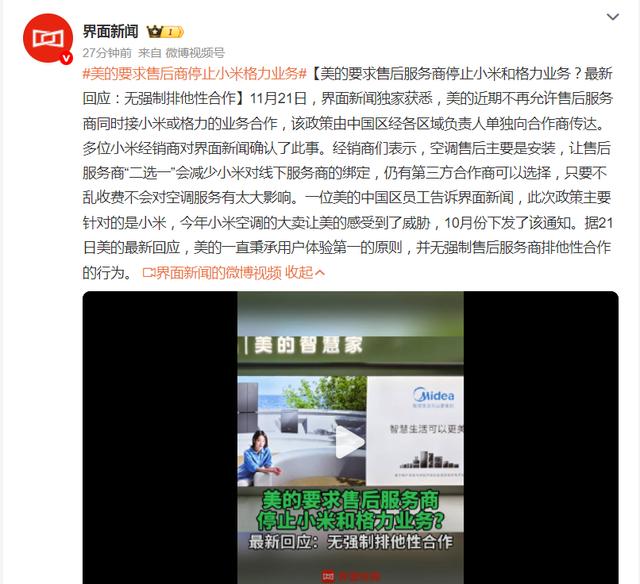 11月21日,智通财经的一则报道引发家电行业高度关注,其中提及: "美的近期不再允许售后服务商同时接小米或格力的业务合作,该政策由中国区经各区域负责人单独向 合作商传达,涉及小米、格力等其他品牌的空调售后及安装维修;" "一位美的中国区员工告诉智通财经,此次政策主要针对的是小米,今年小米空调的大卖让美的感受到 了威胁,10月份下发了该通知,对家电信后体系尚不成熟的小米而言,此举是打在了七寸上…" 不禁要问,美的为何突然"变脸?",格力和小米如何"接招?" 01,家电巨头博弈,火药味渐浓! 今天上午,媒体《智通财经》独家报道了"美的要求售后停止小米格力业务"的消息,相关话题很快空降 微博热搜,数小时后的午间时分,媒体《第一财经》、《每日经济新闻》等又相继进行跟踪报道,强调 美的集团进行了否认:"无强制售后服务他性合作的行为。" 也就是说,界面记者获取的信源按照报道的口吻来看同样也是可靠的,所以,仅凭现有的线索,我们认 为还难以推翻界面的独家报道,毕竟家电大品牌的渠道网络遍布全国,相对的政策细则可能也有区别, 你采访了A区域的负责人/员工得到的回应跟B区域大概率也是有出入的,即颗粒度不可能对齐。 So,还是回归文 ...