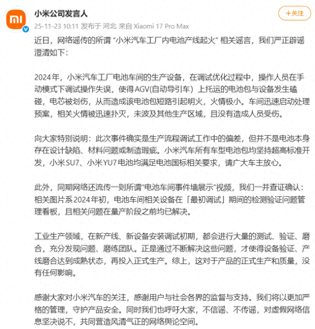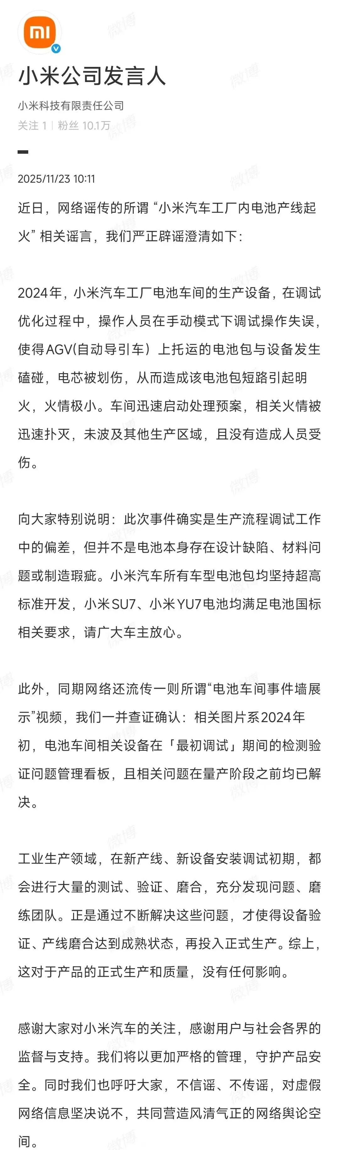 23日上午,小米公司发言人通过微博辟谣"小米汽车工厂内电池产线起火"相关谣言。 向大家特别说明,此次事件确实是生产流程调试工作中的偏差,但并不是电池本身存在设计缺陷、材料 问题或制造瑕疵。小米汽车所有车型电池包均坚持超高标准开发,小米SU7、小米YU7电池均满足电池 国标相关要求,请广大车主放心。 此外,同期网络还流传一则所谓"电池车间事件墙展示"视频,我们一并查证确认:相关图片系2024年 初,电池车间相关设备在"最初调试"期间的检测验证问题管理看板,且相关问题在量产阶段之前均已解 决。 工业生产领域,在新产线、新设备安装调试初期,都会进行大量的测试、验证、磨合,充分发现问题、 磨练团队。正是通过不断解决这些问题,才使得设备验证、产线磨合达到成熟状态,再投入正式生产。 综上,这对于产品的正式生产和质量,没有任何影响。 小米公司发言人发文称,2024年,小米汽车工厂电池车间的生产设备,在调试优化过程中,操作人员在 手动模式下调试操作失误,使得AGV(自动导引车)上托运的电池包与设备发生磕碰,电芯被划伤, 从而造成该电池包短路引起明火,火情极小。车间迅速启动处理预案,相关火情被迅速扑灭,未波及其 他生产区域,且 ...