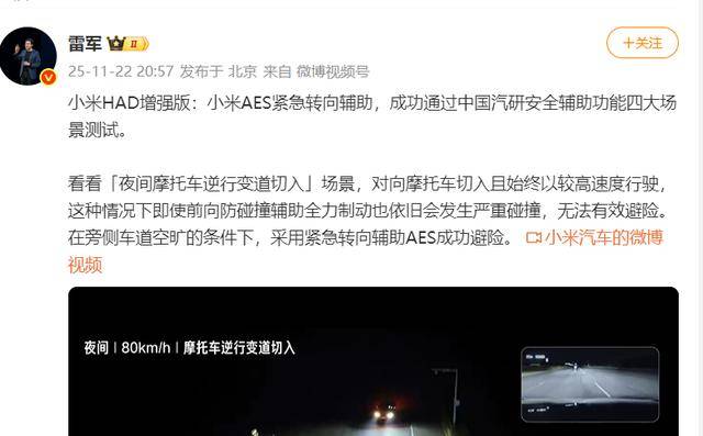 11月23日,雷军发文总结小米端到端辅助驾驶HAD增强版的升级点。纵向加减速更舒适,旁车加塞时 可提前预判减速,及时跟车提速,行车更舒适安全。横向变道更丝滑,在变道并线、借道绕行时表现更 自然流畅。路况理解能力提升,在多车道复杂大路口能提前看懂导航信息,优化走对路、选对道的能 力。 此外,雷军还强调,辅助驾驶不是自动驾驶,驾驶时仍需时刻保持专注。此前在11月21日2025广州车展 开幕日,小米汽车端到端辅助驾驶"Xiaomi HAD增强版"正式发布,其在1000万Clips版本基础上引入"强 化学习"与"世界模型",AEB防碰撞辅助升级,新增紧急转向辅助。 ...