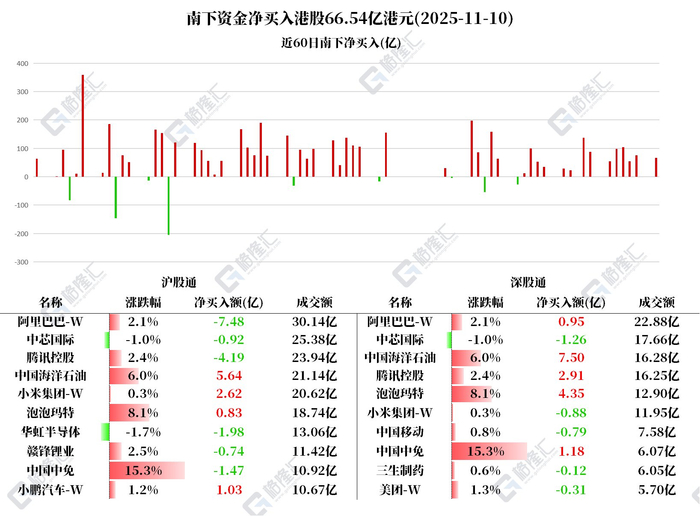 沪港通(南向)十大活跃成交公司 | 公司名称 | 成交金额 | 净买入额 | | --- | --- | --- | | 阿里巴巴-W(09988) | 22.88 亿元 | +9526.90 万元 | | 中芯国际(00981) | 17.66 亿元 | -1.26 亿元 | | 中国海洋石油(00883) | 16.28 亿元 | +7.50 亿元 | | 腾讯控股(00700) | 16.25 亿元 | +2.91 亿元 | | 泡泡玛特(09992) | 12.90 亿元 | +4.35 亿元 | | 小米集团-W(01810) | 11.95 亿元 | -8838.56 万元 | | 中国移动(00941) | 7.58 亿元 | -7898.45 万元 | | 中国中免(01880) | 6.07 亿元 | +1.18 亿元 | | 三生制药(01530) | 6.05 亿元 | -1160.94 万元 | | 美团-W(03690) | 5.70 亿元 | -3062.87 万元 | 深港通(南向)十大活跃成交公司 智通财经APP获悉,2025年11月10日当天,阿里巴巴-W(09988)、中芯 ...