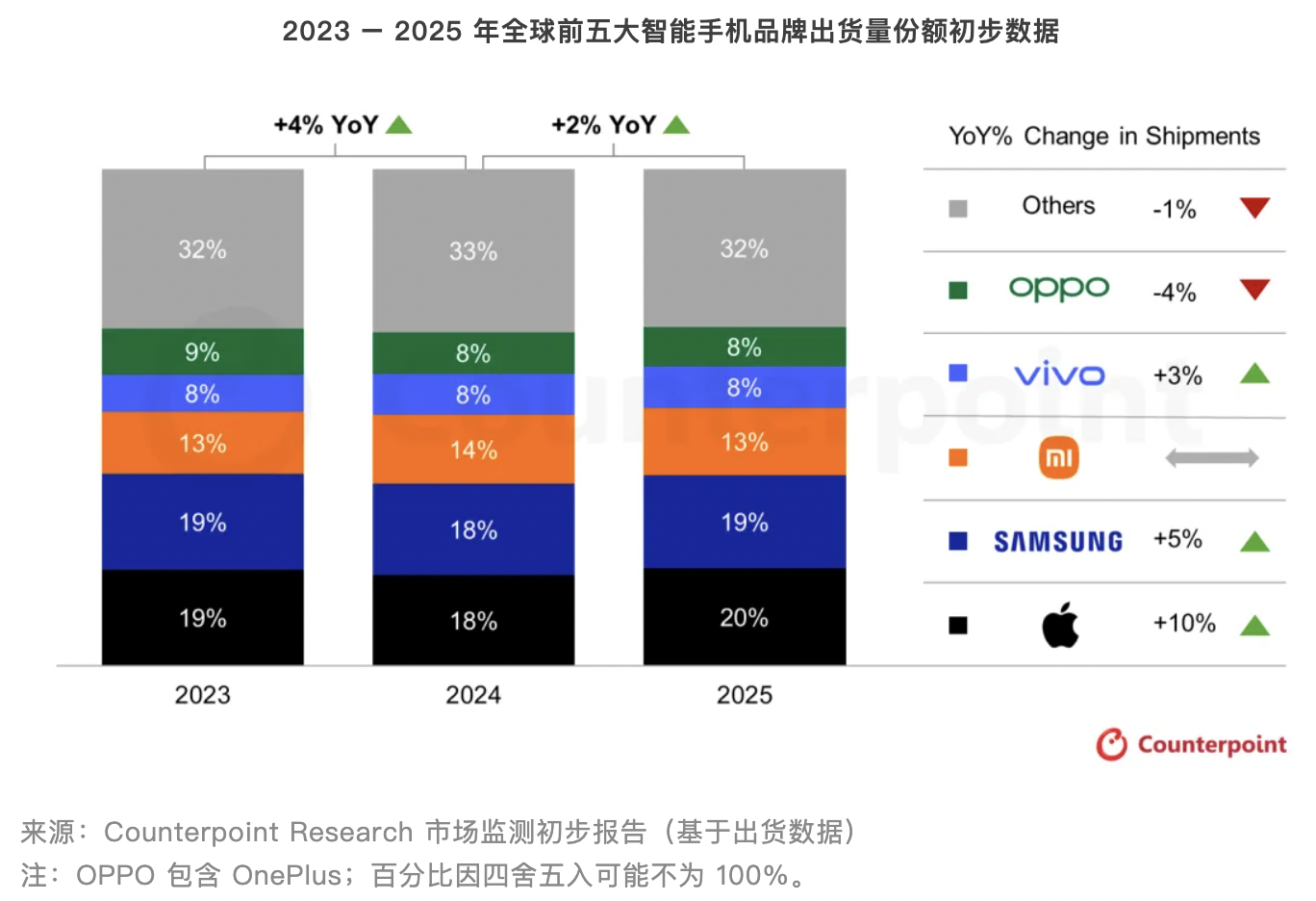 苹果登顶2025全球手机市场份额榜,三星和小米位列第二、三名