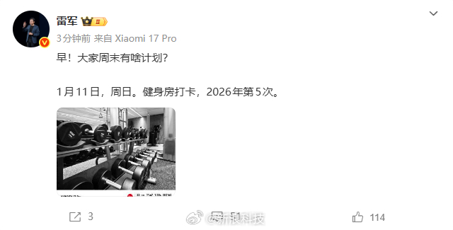 【#雷军26年第5次健身打卡#】今日清晨,小米创办人、董事长兼CEO@雷军 在微博发文:"早!大家 周末有啥计划?1月11日,周日。健身房打卡,2026年第5次。" 雷军曾称自己在2026年立了3个flag:健身打卡100次、学会叉车、交付55万辆小米汽车。 ...