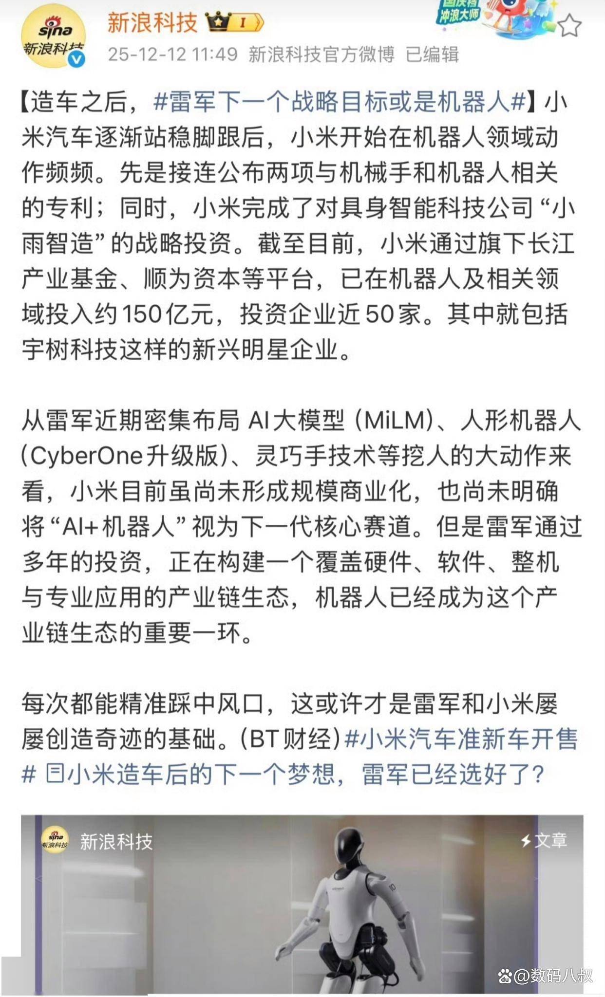 刚刚,新浪科技消息,造车成功之后,雷军下一个战略目标或是机器人。 在造车的时候,雷军不是说这是最后一次创业吗?看来这次雷军还想再拼一把。 度 砂 可 ( N ) # 目小米造车后的下一个梦想,雷军已经选好了" sina 新浪科技 新浪科技 A % (1) Zach 卢泽宇 e status 关注 据悉,小米已经有两项与机械手和机器人相关的专利,同时完成了对具身智能科技公司"小雨智造"的战略投资。 另外,小米通过旗下长江产业基金、顺为资本等平台,已在机器人及相关领域投入约150亿元,投资企业近50家。 小米汽车,一炮成名,相信小米机器人,小米也一定能成功的,期待性价比高的小米机器人的早日到来。 ...
