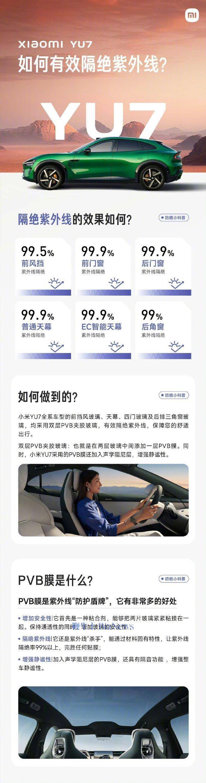 Core Viewpoint - Xiaomi's YU7 model demonstrates exceptional UV protection capabilities, achieving over 99% UV blockage through advanced glass technology [1][4]. Group 1: Product Features - The YU7 model features a special PVB film layer in its glass, which effectively blocks over 99% of ultraviolet and infrared rays [1]. - The front windshield of the YU7 achieves a UV blockage rate of 99.5%, while the side and rear windows, as well as the EC smart sunroof, reach up to 99.9% [1]. - All glass components in the YU7, including the front windshield, sunroof, and side windows, utilize double-layer PVB laminated glass for enhanced UV protection and comfort [4][10]. Group 2: Technical Specifications - The double-layer PVB laminated glass consists of a PVB film sandwiched between two layers of glass, which not only blocks UV rays but also adds acoustic damping for improved cabin quietness [4][10].