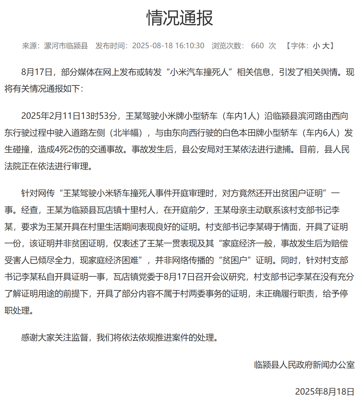 村支部书记李某未正确履行职责,给予停职处理。 8月18日,河南省漯河市临颍县人民政府新闻办公室发布情况通报,8月17日,部分媒体在网上发布或转发"小米汽车撞死人"相关信息,引发了相关舆情。现 将有关情况通报如下: 2025年2月11日13时53分,王某驾驶小米牌小型轿车(车内1人)沿临颍县滨河路由西向东行驶过程中驶入道路左侧(北半幅),与由东向西行驶的白色本田 牌小型轿车(车内6人)发生碰撞,造成4死2伤的交通事故。事故发生后,县公安局对王某依法进行逮捕。目前,县人民法院正在依法进行审理。 针对网传"王某驾驶小米轿车撞死人事件开庭审理时,对方竟然还开出贫困户证明"一事。经查,王某为临颍县瓦店镇十里村人,在开庭前夕,王某母亲主动 联系该村支部书记李某,要求为王某开具在村里生活期间表现良好的证明。村支部书记李某碍于情面,开具了证明一份,该证明并非贫困证明,仅表述了王 某一贯表现及其"家庭经济一般,事故发生后为赔偿受害人已倾尽全力,现家庭经济困难",并非网络传播的"贫困户"证明。 同时,针对村支部书记李某私自开具证明一事,瓦店镇党委于8月17日召开会议研究,村支部书记李某在没有充分了解证明用途的前提下,开具了部分内 ...