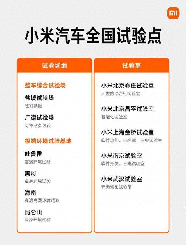 在北京、上海、南京、武汉 4城,规划了150多个试验室。 北京:小米北京亦庄试验室:大型的综合性试验室。小米北京昌平试验室:智能化试验室。 上海:侧重做开发测试类的试验,比如软件功能、三电。另外还有造型试验室,里面有油泥铣削的设 备,方便快速做 1:1 整车油泥模,让方案快速落地验证。 南京:核心是三电、零部件、整软。 武汉:核心做辅助驾驶。 还有4大极端环境试验基地:吐鲁番(高温)、黑河(高寒)、昆仑山(高原)、海南(高温高湿)。 2个整车综合试验场:安徽广德、江苏盐城,负责整车性能验证及可靠性耐久试验。 目前全国泛化路测:已经覆盖 300 余个城市、2300 余台测试车、累计完成超 2800万公里。 来源: @ 小米汽车 ...
