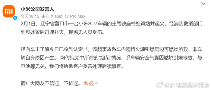 截图 转自:扬子晚报 @小米公司发言人 2月4日消息,2月1日,辽宁省营口市一台小米SU7车辆的主驾驶座椅处冒烟并起火, 经消防救援部门到场处置后迅速扑灭,现场无人员受伤。 网传视频 经向车主了解今日已收到认定书,该起事故系车内遗留火源引燃周边可燃物所致,非车辆自身原因产 生。 网传视频中所谓的"烟花"情况,系车辆安全气囊因燃烧引爆导致,与电池等无关。我们将协助客 户妥善处理后续事宜。 请广大网友不信谣、不传谣。 来源:@小米公司发言人 ...