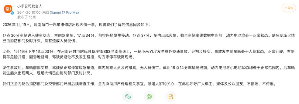 今日早间,小米公司就"两起汽车起火事件"发布通报。 小米公司发言人官微1月20日发文称, 2026年1月19日,海南海口一汽车维修店出现火情一事, 现将我们了解的信息同步如下: 17点30分车辆进入驻车状态,主副驾离车。17点34分,前排座椅发生移动。17点37分,车内出现火情。截至车辆离线数据中断前,动力 电池均处于正常状态。随后现场火情已由消防部门及时扑灭,没有造成人员受伤。 此外, 1月19日下午16点03分, 在河南开封市尉氏县蔡庄镇S83兰南高速上, 一辆小米YU7发生意外交通事故。 经初步核实,事故发生 前车辆处于人驾状态,正常行驶,右侧货车危险并道,因雪地路滑,驾驶员避让不及发生碰撞,对方未停车驶离现场。 发生事故后,车辆前部受损,驾驶员正常停靠应急车道,车内驾乘人员及时撤离,无人员伤亡。截止16点14分车辆离线前,动力电池与小 电池状态均处于正常范围内。后车辆发生起火出现明火,现场火情已由消防部门及时扑灭。 我们正全力配合消防部门及交管部门开展后续调查工作,全力协助用户处理相关事宜。感谢大家的关心,在此也呼吁广大车主、媒体及公众 朋友,不信谣、不传谣。 ...
