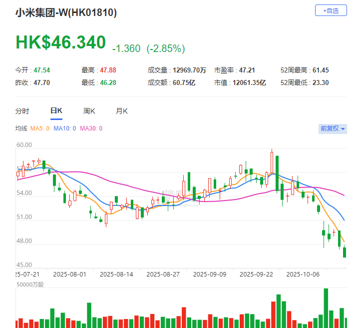Core Viewpoint - Xiaomi Group's stock has experienced a decline of over 15% this month, with a current drop of 3.82% to HKD 45.88, amid ongoing concerns related to the SU7 incident and market speculation [1] Group 1: Stock Performance - Xiaomi Group's stock fell by more than 4%, with a total decline exceeding 15% in the month [1] - The current trading price is HKD 45.88, with a trading volume of HKD 10.359 billion [1] Group 2: Incident Impact - The SU7 incident in Chengdu has raised safety concerns, particularly regarding the car's door locking mechanism, which contradicts Xiaomi's customer service claims [1] - The National Market Regulation Administration announced new reporting systems for electric vehicle fire incidents and remote upgrades, indicating increased regulatory scrutiny [1] Group 3: Market Analysis - According to CCB International, Xiaomi's stock price volatility is influenced by multiple news events, including the Chengdu SU7 accident and the testing of a third model in Xinjiang [1] - Despite the improved performance of the Xiaomi 17 series compared to the Xiaomi 15, the gross profit margin (GPM) for Xiaomi smartphones is expected to hit a low point in the second half of the year [1]