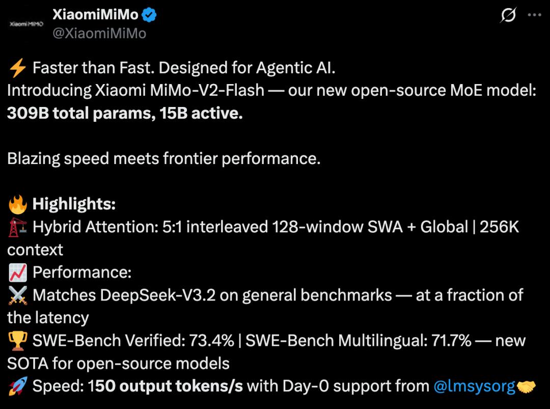 从市场影响来看,MiMo-V2-Flash的入局可能搅动现有开源AI模型的竞争格局。其官方公布的每百万输入token 0.1美元、输出token 0.3美元的极低 成本,结合高达150 tokens/秒的推理速度,为开发者和企业提供了极具吸引力的选择,或将加速高性能AI技术在更广泛场景的应用和普及,尤其 是对其庞大的"手机 x AIoT"生态系统形成强大赋能。 11个小时前,小米深夜"突袭式"发布并开源了其最新的专家混合架构(MoE)大语言模型MiMo-V2-Flash。该模型总参数量达3090亿,活跃参数为 150亿,采用对开发者友好的MIT开源协议,基础版权重也已经在Hugging Face上发布。 小米MiMo团队负责人罗福莉(Fuli Luo)在社交平台上明确表示:"MiMo-V2-Flash已经上线。这只是我们AGI路线图上的第二步。"这一表态凸 显了小米在AI领域的长远规划和技术雄心。 性能媲美DeepSeek-V3.2,并且"极具性价比" MiMo-V2-Flash在多个权威基准测试中展现了强大的实力,其性能表现足以和部分顶尖的开源及闭源模型同台竞技。 根据小米官方公布的数据,在衡量编程能力的S ...