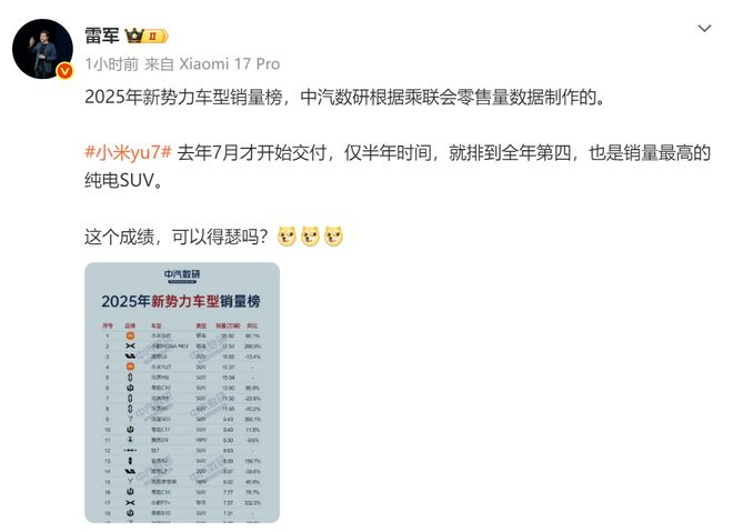 小米SU7获2025年度纯电动车保值率第一,雷军回应:感谢每一位用户的认可