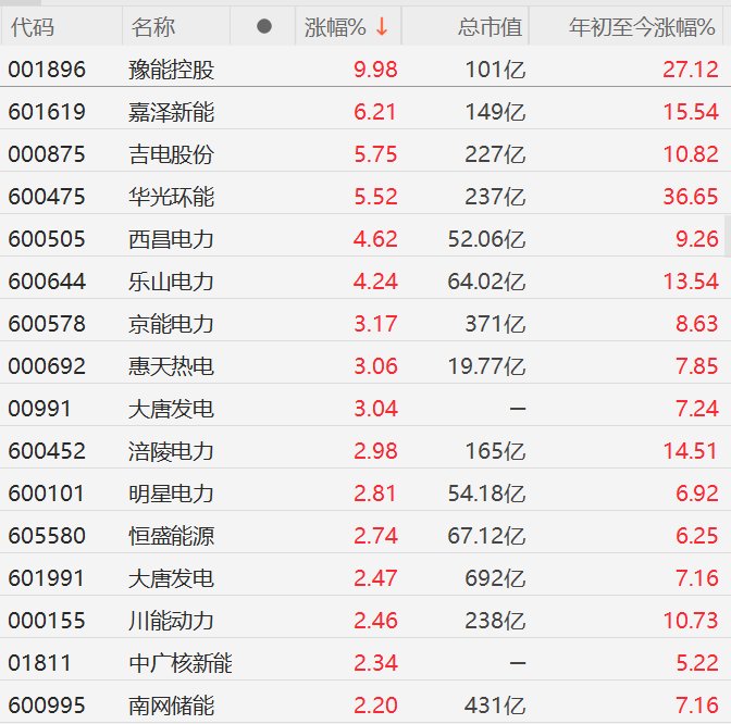 责任编辑:栎树 | 代码 | 名称 | 涨幅% ↓ | 总市值 | 年初至今涨幅% | | --- | --- | --- | --- | --- | | 001896 | 豫能控股 | 9.98 | 101亿 | 27.12 | | 601619 | 嘉泽新能 | 6.21 | 149亿 | 15.54 | | 000875 | 吉电股份 | 5.75 | 227亿 | 10.82 | | 600475 | 東州駅 | 5.52 | 237亿 | 36.65 | | 600505 | 西昌电力 | 4.62 | 52.06亿 | 9.26 | | 600644 | 乐山电力 | 4.24 | 64.02亿 | 13.54 | | 600578 | 京能电力 | 3.17 | 371亿 | 8.63 | | 000692 | 惠天热电 | 3.06 | 19.77亿 | 7.85 | | 00991 | 大唐发电 | 3.04 | l | 7.24 | | 600452 | 涪陵电力 | 2.98 | 165亿 | 14.51 | | 600101 | 明星电力 | 2.81 | 54.18亿 | 6.92 ...