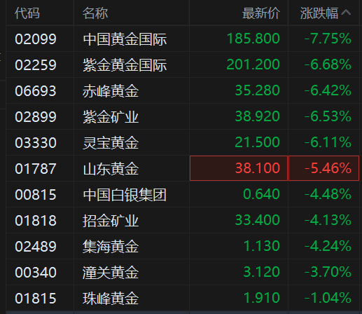 港股黄金股集体下挫,其中,中国黄金国际跌近8%,紫金黄金国际跌近7%,赤峰黄金、紫金矿业、灵 宝黄金跌超6%,山东黄金跌5.5%,中国白银集团、招金矿业、潼关黄金、珠峰黄金跟跌。 | 代码 | 名称 | 最新价 | 涨跌幅 ^ | | --- | --- | --- | --- | | 02099 | 中国黄金国际 | 185.800 | -7.75% | | 02259 | 紫金黄金国际 | 201.200 | -6.68% | | 06693 | 赤峰黄金 | 35.280 | -6.42% | | 02899 | 常受矿业 | 38.920 | -6.53% | | 03330 | 灵宝黄金 | 21.500 | -6.11% | | 01787 | 山东黄金 | 38.100 | -5.46% | | 00815 | 中国白银集团 | 0.640 | -4.48% | | 01818 | 招类矿业 | 33.400 | -4.13% | | 02489 | 集海黄金 | 1.130 | -4.24% | | 00340 | 滝关黄金 | 3.120 | -3.70% | | 01815 | 珠峰黄金 ...