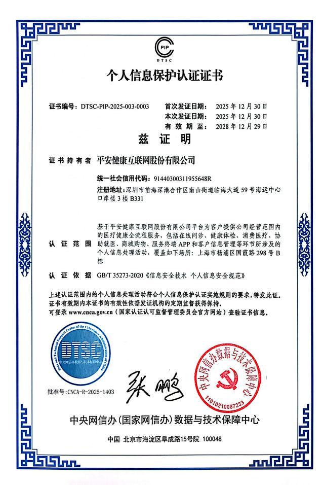 全国首批、行业首家!平安好医生获中央网信办个人信息保护认证