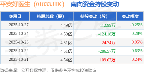 平安好医生(01833.HK):10月27日南向资金减持112.99万股