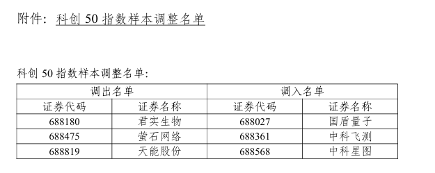 根据指数规则,上海证券交易所与中证指数有限公司决定调整科创50等指数样本,于2026年3月13日收 市后生效。其中科创50指数更换3只样本,将君实生物(688180.SH)、萤石网络(688475.SH)、天能股份 (688819.SH)调出名单;将国盾量子(688027.SH)、中科飞测(688361.SH)、中科星图(688568.SH)调入名 单。 | 调出名单 | | 调入名单 | | | --- | --- | --- | --- | | 证券代码 | 证券名称 | 证券代码 | 证券名称 | | 688180 | 君实生物 | 688027 | 国盾量子 | | 688475 | 竜石网络 | 688361 | 中科飞测 | | 688819 | 天能股份 | 688568 | 中科星图 | ...