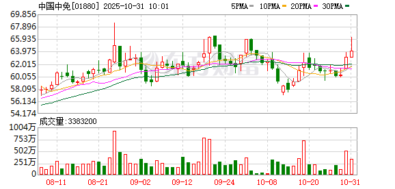 中国中免(601888)(01880)涨超4%,截至发稿,涨4.12%,报65.75港元,成交额1.3亿港元。 消息面上,10月30日,财政部等五部门公开《关于完善免税店政策支持提振消费的通知》,从四方面完 善了现有的免税店政策,今年11月1日起实施。通知明确,优化国内商品退(免)税政策管理,积极支 持口岸出境免税店和市内免税店销售国产品,鼓励免税店引入更多能够体现中华优秀传统文化的特色优 质产品,增加国产品在免税店的销售。 中国中免昨晚公告,该集团2025年前三季度取得营业收入398.62亿元,同比减少7.34%;归母净利润 30.52亿元,同比减少22.13%。此外,中国中免还披露了2025年前三季度分红方案,拟向全体股东每股 派发现金红利0.25元(含税),合计拟派发现金红利为5.17亿元(含税),占2025年前三季度归属于上 市公司股东净利润的比重为16.95%。这也是中国中免首次实施中期分红。 ...