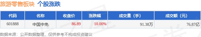 从资金流向上来看,当日旅游零售板块主力资金净流入11.38亿元,游资资金净流出6.86亿元,散户资金 净流出4.52亿元。旅游零售板块个股资金流向见下表: 证券之星消息,11月10日旅游零售板块较上一交易日上涨10.0%,中国中免领涨。当日上证指数报收于 4018.6,上涨0.53%。深证成指报收于13427.61,上涨0.18%。旅游零售板块个股涨跌见下表: | 代码 | 名称 | 收盘价 | 涨跌幅 | 成交量(手) | | 成交额(元) | | | --- | --- | --- | --- | --- | --- | --- | --- | | 601888 | 中国中免 | 66.89 | 10.00% | | 91.38万 | | 76.87 7 | 以上内容为证券之星据公开信息整理,由AI算法生成(网信算备310104345710301240019号),不构成投资建议。 | 601888 中国中免 111 100 1 1 1999 11 1999 111 1994 11 25 1 1 1 1999 11 11 199 1 1 - | 11.38亿 | 14.80% | -6.861Z | -8. ...