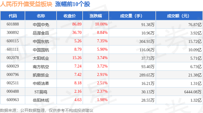 证券之星消息,11月10日人民币升值受益板块较上一交易日上涨3.62%,中国中免领涨。当日上证指数 报收于4018.6,上涨0.53%。深证成指报收于13427.61,上涨0.18%。人民币升值受益板块个股涨跌见下 表: | 代码 | 名称 | 收盘价 | 涨跌幅 | 成交量(手) | 成交额(元) | | --- | --- | --- | --- | --- | --- | | 601888 | 中国中免 | 86.89 | 10.00% | 91.38万 | 76.87 Z | | 300892 | 品屋食品 | 36.70 | 8.84% | 10.96万 | 3.92亿 | | 600115 | 中国东航 | 5.26 | 7.35% | 304.93万 | 15.72亿 | | 601111 | 中国国航 | 8.79 | 5.90% | 116.06万 | 10.09亿 | | 002078 | 太阳纸业 | 15.26 | 3.74% | 37.73万 | 5.71亿 | | 600029 | 南方航空 | 7.24 | 3.72% | 93.40万 | 6.73亿 | | 000796 | ...