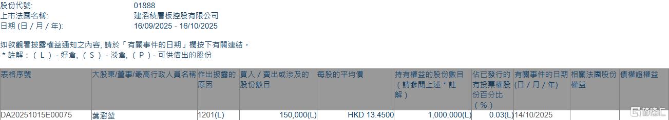 建滔积层板(01888.HK)遭独立非执行董事叶澍堃减持15万股