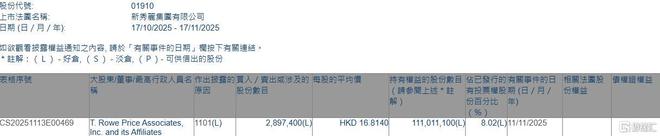 新秀丽(01910.HK)获T. Rowe Price Associates, Inc.增持2...