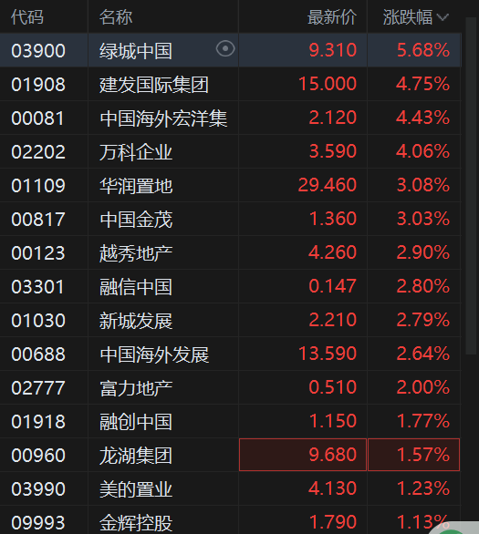 平安证券研报指出,2025年楼市降幅收窄,2026年曙光渐行渐近。展望2026年,预计"好房子"凭借品 质/得房率等优势仍将成为提振新房销售的重要因素。 港股内房股逆势拉升,其中,绿城中国涨近6%,建发国际集团涨近5%,中国海外宏洋集团涨4.4%,华 润置地、中国金茂涨3%,越秀地产、融信中国、富力地产、融创中国、龙湖集团、美的置业均涨超1% 以上。 消息上,中国内地近期推出的针对性金融措施,例如人行近期下调再贷款利率25个基点,并将商业房地 产最低首付比例从50%降至30%。 申万宏源认为,我国房地产基本面已经历深度调整,考虑到近期中央要求"着力稳定房地产市场",并今 年年初央媒《求是》为房地产重磅发声,其中强调地产金融属性、居民资产负债表及建议政策一次性给 足,房地产表态出现积极转变,后续行业政策值得期待。 | 代码 | 名称 | 最新价 | 涨跌幅 √ | | --- | --- | --- | --- | | 03900 | 绿城中国 | 9.310 | 5.68% | | 01908 | 建发国际集团 | 15.000 | 4.75% | | 00081 | 中国海外宏洋集 | 2.120 | 4. ...