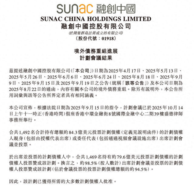 10月14日,融创中国控股有限公司发布公告,在当日举行的境外债重组计划会议中,合计共有1492名债 权人投票,其中1469名债权人投票赞成重组计划,赞成票人数占比达98.5%,对应债务金额支持率 94.5%。至此,融创境外债重组方案已赢得所需大多数计划债权人批准。鉴于本次表决结果远超75%金 额门槛,已满足法院批准的核心要求,方案随之将迎来法院批准流程。公告明确,香港高等法院将于11 月5日举行聆讯,对其重组方案作出最终裁决。 ...