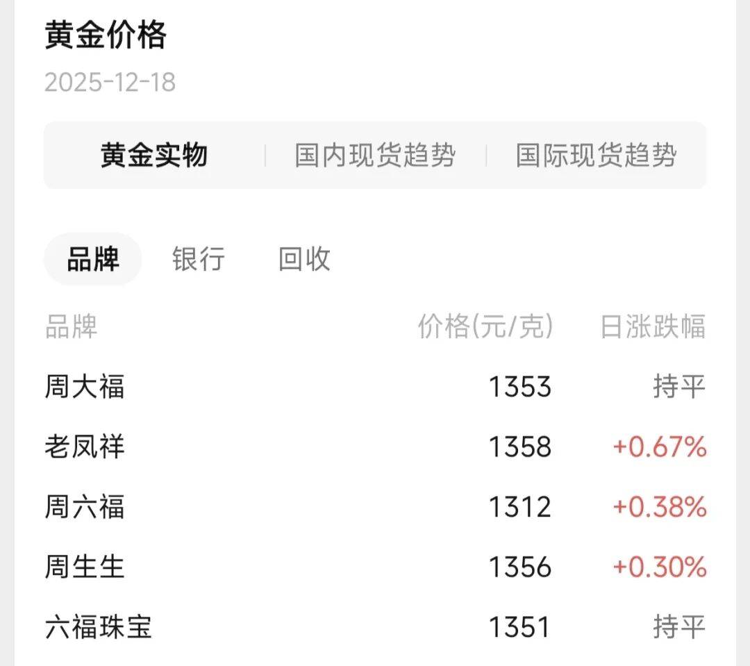 周大福官方旗舰店在首页公告 ↓↓↓ 近几日 黄金市场堪称"过山车" 12月16日午后 跳水跌破4300美元 当晚却直线拉升 12月18日,国际现货黄金现货 最新价格为4331.82美元/盎司 而金价波动也迅速传导至消费端 17日、18日 多家品牌黄金足金饰品价格略有上涨 | 12月18日部分品牌金饰品价格 | | --- | | 12月17日 | 部分商品今天(12月19日)将提价 受市场因素影响 如果算上3月份和10月份的提价,这也是周大福在今年对一口价黄金产品的第三次提价。在社交平台上,多地周大福门店销售表示已经陆续收到新价签。 今年3月,周大福上调了一口价黄金产品,调价幅度为10%-20%。10月底,周大福再次上调价格。根据当时周大福官方预计,大多数产品的提价幅度在 12%至18%之间,而这一调整主要基于国际金价持续上涨带来的成本压力。 不过从实际涨价情况来看 部分畅销款一口价黄金产品 的实际涨幅超过30% 如27克左右的爆款五帝钱盘缠手串,价格从38600元上调至50800元,从标价来看上涨幅度为31.6%。而根据周大福柜姐晒出的新价签,本周五上调之后的 新价格为53800元。 根据柜姐陆续晒出的新旧 ...