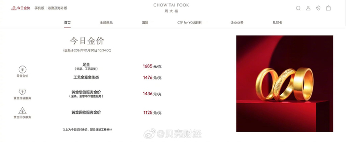 多品牌金饰克价大幅回调,周大福等报价跌至1685元