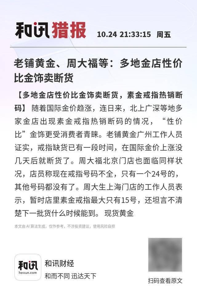 Group 1 - The core viewpoint of the article highlights that gold jewelry, particularly plain gold rings, is experiencing a surge in demand across major cities in China due to rising international gold prices, leading to stock shortages in various stores [1][2] - Several gold retailers, including Lao Pu Gold and Chow Tai Fook, have reported that they are facing inventory shortages, with specific sizes of rings being sold out [1][2] - The Guangzhou store of Lao Pu Gold confirmed that the shortage has persisted for some time, occurring shortly after the increase in international gold prices [1][2] Group 2 - Chow Tai Fook's Beijing store indicated that only one size (size 24) of rings is available, with all other sizes out of stock [1][2] - The Shanghai store of Zhou Dazheng mentioned that the largest available size of plain gold rings is currently size 15, and they are uncertain when the next shipment will arrive [1][2]