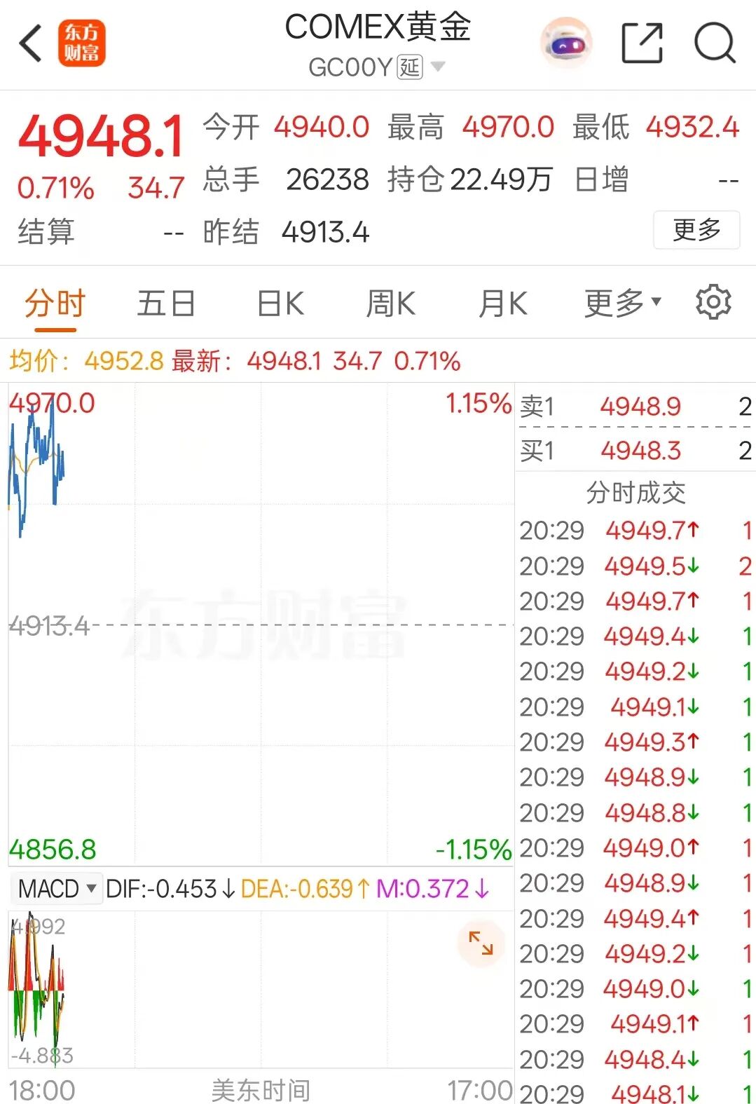 1月23日早盘,现货黄金持续拉涨,盘中最高一度突破4970美元/盎司。 | COMEX更全 | | | | --- | --- | --- | | GCOOY 延 ▼ | | | | 4948 1 今天 4940.0 最高 4970.0 最低 4932.4 | | | | 总手 26238 持仓 22.49万 日增 0.71% 34.7 | | | | 更关 结算 昨结 4913.4 | | | | 分时 FF 間K 月K 更多▼ | | | | 均价:4952.8 最新:4948.1 34.7 0.71% | | | | 4970.0 1.15% 卖1 4948.9 | | | | द्मी 4948.3 2 | | | | 分时成交 | | | | 20:29 4949.71 | | | | 20:29 4949.54 | | | | 20:29 4949.71 | | | | 4913.4-- 20:29 4949.44 | | | | 20:29 4949.24 | | | | 20:29 4949.14 | | | | 20:29 4949.31 | | | | 20:29 4948.94 | 1 ...
