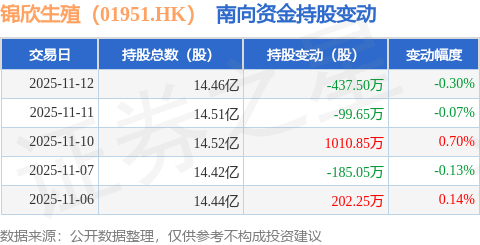 | 交易日 | 持股总数(股) | 持股变动(股) | 变动幅度 | | --- | --- | --- | --- | | 2025-11-12 | 14.46 Z | -437.50万 | -0.30% | | 2025-11-11 | 14.51亿 | -99.65万 | -0.07% | | 2025-11-10 | 14.52亿 | 1010.85万 | 0.70% | | 2025-11-07 | 14.42 乙 | -185.05万 | -0.13% | | 2025-11-06 | 14.44亿 | 202.25万 | 0.14% | 证券之星消息,11月12日南向资金减持437.5万股锦欣生殖(01951.HK)。近5个交易日中,获南向资金 增持的有2天,累计净增持490.9万股。近20个交易日中,获南向资金增持的有11天,累计净增持2287.7 万股。截至目前,南向资金持有锦欣生殖(01951.HK)14.46亿股,占公司已发行普通股的52.44%。 锦欣生殖医疗集团有限公司是一家投资控股公司,主要提供试管受精(IVF)服务。该公司通过其子公 司主要提供辅助生殖服务、管理服务、流动手术中心 ...