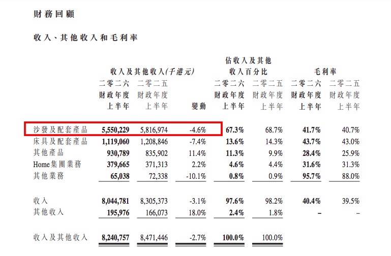 Financial Performance - For the six months ended September 30, 2025, the company reported revenue of approximately HKD 8,044,781, a decrease of about 3.1% year-on-year[6]. - Total revenue for the six months ended September 30, 2025, was HKD 8,240,757, a decrease of 2.73% compared to HKD 8,471,446 in the same period of 2024[71]. - Gross profit for the same period was HKD 3,250,161, down 0.93% from HKD 3,280,649 year-over-year[71]. - Net profit for the period was HKD 1,206,334, representing a slight increase of 0.67% from HKD 1,194,555 in the previous year[72]. - Net profit attributable to equity holders increased by about 0.6% to HKD 1,145,578,000, with a net profit margin of approximately 14.2%, up from 13.7% in the previous year[27]. - Total comprehensive income for the period was HKD 1,471,225, an increase of 9.68% from HKD 1,341,679 in the same period last year[72]. - The profit attributable to the company's owners for the six months ended September 30, 2025, was HKD 1,145,578,000, a slight increase from HKD 1,138,925,000 in the same period of 2024, representing a growth of approximately 0.3%[106]. Revenue Breakdown - Sofa sales in the Chinese market generated revenue of approximately HKD 3,083,855, down 6.1% from HKD 3,285,505 in the previous year[11]. - Revenue from the North American market was approximately HKD 2,160,622, a slight increase of 0.3% year-on-year[8]. - Revenue from bedding and related products was approximately HKD 1,119,060,000, a decrease of about 7.4% compared to HKD 1,208,846,000 in the same period last year, primarily due to significant consumption downgrade in the Chinese market[12]. - Revenue from other products reached approximately HKD 930,789,000, an increase of about 11.4% from HKD 835,902,000 in the previous year, driven by sales growth of metal frames and smart furniture in overseas markets[13]. - Revenue from the Home Group was approximately HKD 379,665,000, up about 2.2% from HKD 371,313,000 in the same period last year, mainly due to increased demand in the European market[14]. - Revenue from real estate, hotels, and other property leasing was approximately HKD 65,038,000, a decline of about 10.1% from HKD 72,338,000 in the previous year, primarily due to a decrease in real estate income[15]. Cost and Expenses - Cost of goods sold decreased by about 4.6% to HKD 4,794,620,000 from HKD 5,024,724,000, with raw material costs declining more than revenue due to lower unit costs[17]. - Selling and distribution expenses increased by about 1.7% to HKD 1,539,021,000, with the percentage of revenue rising from approximately 18.2% to 19.1%[21]. - Administrative and other expenses rose by about 16.8% to HKD 364,089,000, with the percentage of revenue increasing from approximately 3.8% to 4.5%[23]. - Financial costs decreased by about 45.0% to HKD 40,184,000 from HKD 73,114,000 in the previous year, primarily due to lower loan interest expenses[25]. Assets and Liabilities - Non-current assets increased to HKD 12,042,145 as of September 30, 2025, from HKD 11,690,989 as of March 31, 2025[74]. - Current assets rose to HKD 8,950,908, compared to HKD 8,332,603 at the end of the previous reporting period[74]. - Total liabilities remained stable with current liabilities at HKD 6,111,866, slightly down from HKD 6,114,040[74]. - The company's equity increased to HKD 14,661,001 as of September 30, 2025, from HKD 13,649,166 as of March 31, 2025[75]. Cash Flow and Financing - Operating cash flow for the six months was HKD 1,685,877,000, an increase from HKD 1,584,455,000 in the prior year, representing a growth of about 6.4%[80]. - The company incurred a net cash outflow from investing activities of HKD 1,089,500,000, compared to HKD 1,682,535,000 in the previous year, showing a reduction in cash outflow by approximately 35.3%[80]. - New bank borrowings amounted to HKD 2,583,826,000, an increase from HKD 1,591,460,000 in the previous year, indicating a significant rise in financing activities[80]. - The company paid dividends to equity holders totaling HKD 465,370,000, down from HKD 581,662,000 in the previous year, reflecting a decrease of approximately 20%[80]. Shareholder Information - The company has issued a total of 3,878,083,200 shares as of September 30, 2025[44]. - Min Wah Investment Limited holds 2,426,692,800 shares, representing approximately 62.57% of the company's issued share capital[46]. - Mr. Huang Min Li owns 80% of Min Wah Investment Limited, which translates to a beneficial ownership of 1,941,353,440 shares[44]. - Ms. Xu Hui Qing owns 20% of Min Wah Investment Limited, equating to a beneficial ownership of 485,338,560 shares[44]. - The company declared an interim dividend of HKD 0.12 per ordinary share for the six months ended September 30, 2025, down from HKD 0.15 per share in 2024, resulting in total dividends of HKD 465,370,000 compared to HKD 581,662,000 in the previous year[104]. Corporate Governance - The audit committee consists of three independent non-executive directors, and the interim financial information for the six months ending September 30, 2025, has been reviewed by Ernst & Young[54]. - The company has complied with the corporate governance code, with a noted deviation regarding the separation of the roles of chairman and CEO[61]. - All directors confirmed compliance with the standards of conduct for securities trading during the six-month period ending September 30, 2025[63]. Future Plans and Strategies - The company plans to continue its "smart home" strategy and enhance product innovation and brand building to solidify its market leadership[37]. - The group is exploring potential overseas acquisition targets to respond to changes in the international trade environment[37]. - The group has submitted an application for its subsidiary, Ruimai Technology, to be listed on the National Equities Exchange and Quotations[38].