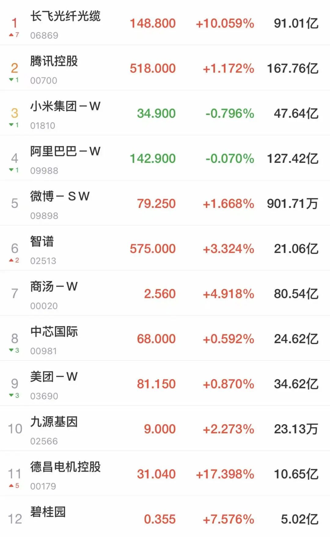 科技巨头方面,腾讯涨超1%,美团、京东、百度等齐涨,阿里一度涨超1.7%,但尾盘转跌。光通信、钢铁、有色、稀土、创新药板块集体大涨。长飞光 纤光缆涨近10%,马鞍山钢铁涨6.6%,金力永磁涨6.7%,中国神华涨近6%,昭衍新药涨6%,康希诺生物涨7%,药明生物涨超3%。 每经记者|杜波 每经编辑|段炼 记者|杜波 编辑|段炼 易启江 校对|许绍航 2月27日,港股收盘,恒生指数收涨0.95%,恒生科技指数收涨0.56%,国企指数收涨0.51%。南向资金净流入超140亿港元。 封面图片:视觉中国(图文无关) | 1 | 长飞光纤光缆 | 148.800 +10.059% 91.01亿 | | | | --- | --- | --- | --- | --- | | -7 06869 | | | | | | 2 | 腾讯控股 | 518.000 +1.172% 167.76亿 | | | | ▼1 | 00700 | | | | | 3 | 小米集团-W | 34.900 -0.796% 47.64亿 | | | | ▼1 | 01810 | | | | | 4 | 阿里巴巴-W | 142.900 -0.070% ...