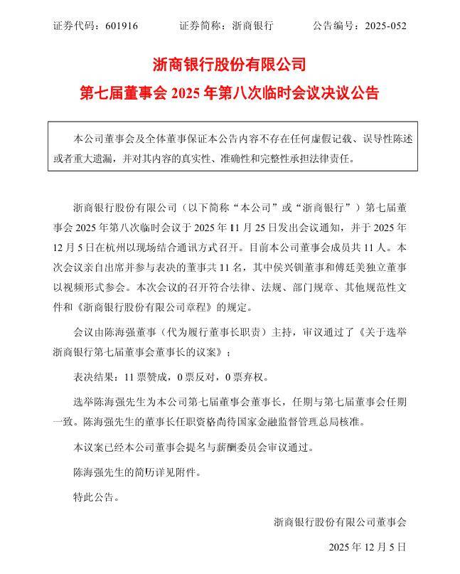 12月5日,浙商银行发布的公告显示,该行于当天召开第七届董事会2025年第八次临时会议,会上审议 通过了《关于选举浙商银行第七届董事会董事长的议案》。 根据公告,浙商银行选举陈海强为该公司第七届董事会董事长,任期与第七届董事会任期一致。陈海强 的董事长任职资格尚待国家金融监督管理总局核准。 《金融时报》记者注意到,今年7月,陆建强因到龄辞去浙商银行董事长、执行董事等职务。同日,浙 商银行发布了董事会决议公告,由执行董事、行长陈海强代为履行董事长、董事会战略与可持续发展委 员会主任委员及法定代表人职责,直至选举产生新任董事长且其任职资格获国家金融监督管理总局核准 之日止。 11月17日,浙商银行发布了关于提名董事长的提示性公告,根据中共浙江省委决定,陈海强出任浙商银 行党委书记,提名陈海强任浙商银行董事长。 公开资料显示,陈海强于1974年10月出生,曾任国家开发银行杭州分行副主任科员,招商银行宁波北仑 支行行长、宁波分行党委委员、行长助理、副行长,浙商银行宁波分行党委书记、行长,杭州分行党委 书记、行长,浙商银行行长助理,浙商银行党委委员、副行长、首席风险官,浙商银行党委副书记。 ...