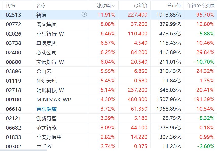 | 代码 | 名称 | | 涨跌幅 √ | 最新价 | 总市值 | 年初至今涨跌 | | --- | --- | --- | --- | --- | --- | --- | | 02513 | 智谱 | (0) | 11.91% | 227.400 | 1013.85 Z | 95.70% | | 00772 | 阅文集团 | | 8.08% | 37.200 | 379.99亿 | 12.80% | | 02026 | 小马智行-W | | 6.46% | 110.400 | 478.63 Z | -5.88% | | 03738 | 阜博集团 | | 6.57% | 4.540 | 115.43亿 | 10.46% | | 02400 | 心动公司 | | 6.25% | 84.200 | 416.89 Z | 29.84% | | 00800 | 文远知行-W | | 6.04% | 20.540 | 211.01亿 | -10.70% | | 03896 | 我们之 | | 5.55% | 6.850 | 310.43 Z | 24.32% | | 01119 | 创梦天地 | | 5.45% | 0 ...