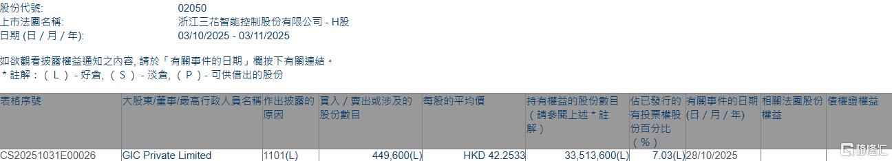 格隆汇11月3日丨根据联交所最新权益披露资料显示,2025年10月28日,三花智控(02050.HK)获GIC Private Limited在场内以每股均价42.2533港元增持44.96 万股,涉资约1899.71万港元。 增持后,GIC Private Limited最新持股数目为3351.36万股,持股比例由6.94%上升至7.03%。 | 股份代號: | 02050 | | --- | --- | | 上市法國名稱: | 浙江三花锋 | | 日期 (日 / 月 / 年): | 03/10/202 | | 表格序號 | 大股東/董事/最高行政人員名稱作出披露的 買入 / 費出或涉及的 每股的平均價 | | | | 持有權益的股份數目 佔已發行的 有關事件的日期 | | | --- | --- | --- | --- | --- | --- | --- | | | 股份數目 | | | | (請參閱上述 * 註 | 有投票權股 (日 / 月 / 年) | | | | | | | | 份百分比 | | | | | | | | 0/0 | | CS20251031E00026 | GIC Private L ...