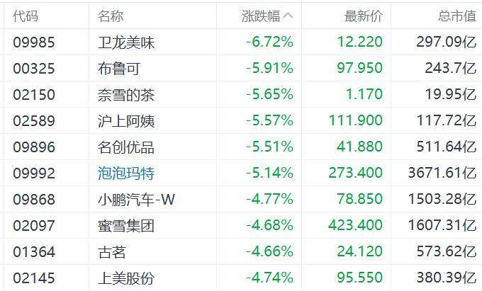 (责任编辑:宋政 HN002) | 代码 | 名称 | 涨跌幅 ^ | 最新价 | 总市值 | | --- | --- | --- | --- | --- | | 09985 | 卫龙美味 | -6.72% | 12.220 | 297.09亿 | | 00325 | 布鲁可 | -5.91% | 97.950 | 243.7亿 | | 02150 | 奈雪的茶 | -5.65% | 1.170 | 19.95亿 | | 02589 | 沪上阿姨 | -5.57% | 111.900 | 117.72亿 | | 09896 | 名创优品 | -5.51% | 41.880 | 511.64亿 | | 09992 | 泡泡玛特 | -5.14% | 273.400 | 3671.61亿 | | 09868 | 小鹏汽车-W | -4.77% | 78.850 | 1503.28亿 | | 02097 | 密雪集团 | -4.68% | 423.400 | 1607.31亿 | | 01364 | 古茗 | -4.66% | 24.120 | 573.62亿 | | 02145 | 上美股份 | -4.74% | ...