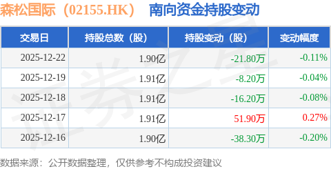 证券之星消息,12月22日南向资金减持21.8万股森松国际(02155.HK)。近5个交易日中,获南向资金 减持的有4天,累计净减持32.6万股。近20个交易日中,获南向资金减持的有15天,累计净减持931.9万 股。截至目前,南向资金持有森松国际(02155.HK)1.9亿股,占公司已发行普通股的15.28%。 森松国际控股有限公司是一家主要从事压力设备的制造及提供综合压力设备解决方案的公司。该公司的 主要产品包括传统压力设备及模块化压力设备。传统压力设备包括换热器、容器、反应器和塔器。模块 化压力设备包括工艺模块及橇块和模块化工厂。该公司还提供压力设备设计、验证及维护服务等增值服 务。该公司于中国国内和海外市场开展业务。 以上内容为证券之星据公开信息整理,由AI算法生成(网信算备310104345710301240019号),不构成 投资建议。 | 交易日 | 持股总数(股) | 持股变动(股) | 变动幅度 | | --- | --- | --- | --- | | 2025-12-22 | 1.90亿 | -21.80万 | -0.11% | | 2025-12-19 | 1.91亿 | -8.20万 ...