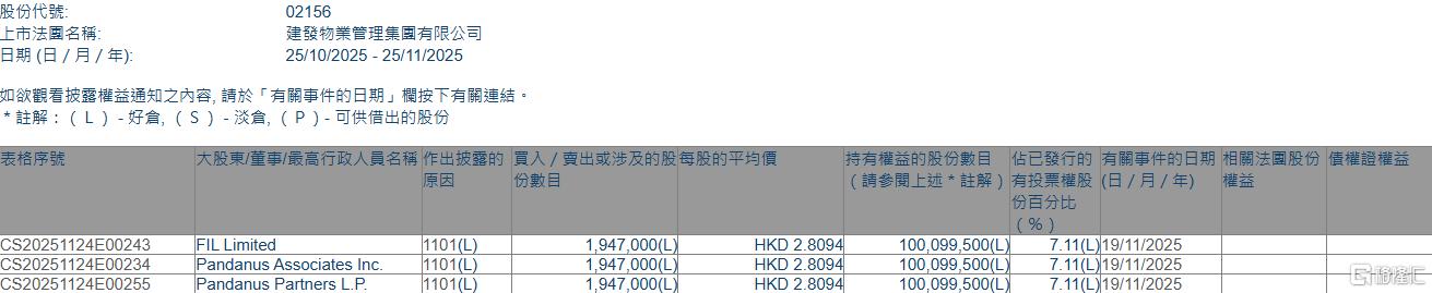 | 股份代號: | 02156 | | --- | --- | | 上市法國名稱: | 建發物業管理集團有限公 | | 日期 (日 / 月 / 年): | 25/10/2025 - 25/11/2025 | | 表格序號 | | 大股東/董事/最高行政人員名稱 作出披露的 冒入 / 萝出或涉及的股每般的平均價 | | | 持有權益的股份數目 佔已發行的 有關事件的日 | | | --- | --- | --- | --- | --- | --- | --- | | | | | 分野信 | | (請參閱上拉*註解)有投票權股(日/月/年) | | | | | | | | 份自分比 | | | | | | | | 963 | | | CS20251124E00243 | FIL Limited | 1101(L) | 1.947.000(L | HKD 2.8094 | 100.099.500(L | 7.11(L)19/11/2025 | | CS20251124E00234 | Pandanus Associates Inc. | 1101(L) | 1.947.000(L | HKD 2.8094 | 10 ...